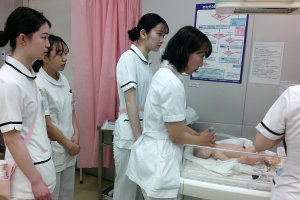 産科は安心して妊娠・出産・育児にのぞめるよう、日本助産評価機構クリニカルラダーレベルⅢ認定のアドバンス助産師7名を含む助産師による保健指導、母乳外来、助産外来を行なっています。また、助産師だけでなく看護師の半数が新生児心肺蘇生法修了資格を得て、母子が安心して入院生活を送れるよう、日々訓練を行っています。婦人科は主に手術と薬物療法、消化器内科・肝臓内科では内視鏡的治療やマイクロ波凝固療法、薬物療法が行われるほか検査・教育入院にも積極的に取り組んでいます。看護師はデイパートナー看護提供方式のもと常にペアで看護を行い、チーム医療の活用、他部門との連携を図り、患者様に最適な治療を受け、快適な療養生活を送っていただけるよう努めています。